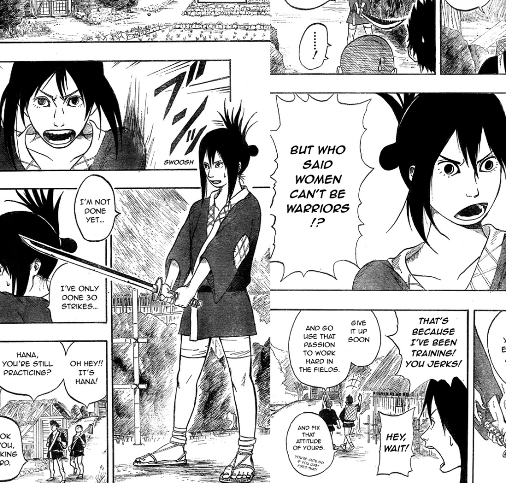The deuteragonist of the tale is a young woman named Hana who aspires to be a swordswoman in a world of swordsmen. Hana is physically weak, and often discouraged by the men of the village, but still practices seriously all the same. Her motivation? She was once saved by a swordsman. Impressed by his strength, she asked if she could learn to be like him. He simply told her she could, and that was all she needed.